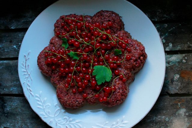 Dortovou formu plníme rozvařeným rybízem, následně těstem a vše dáme péct zhruba na 50 minut.