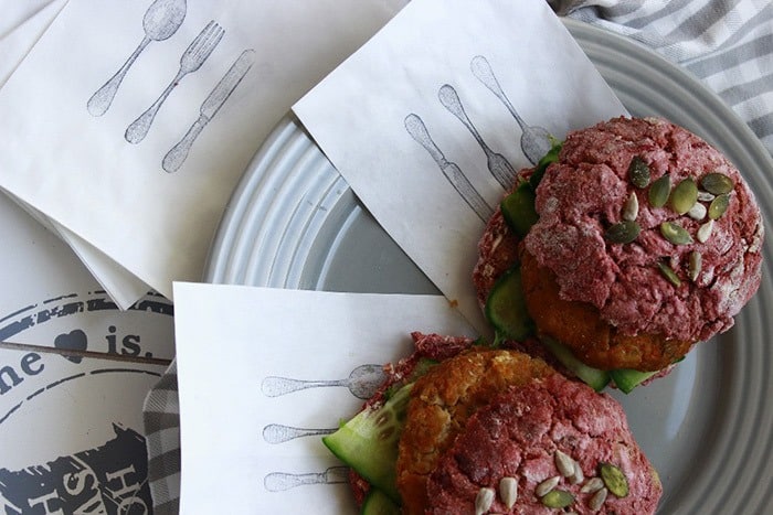 10. Přepůlené housky potřete ochucenou tahini pastou, poklaďte plátky okurky a tofu burgerem.